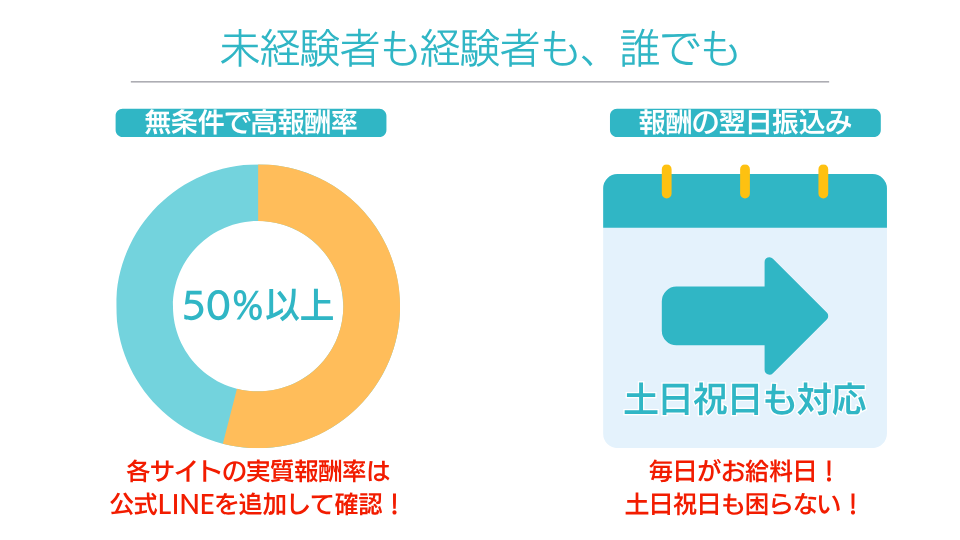 50%~(各サイトの報酬率は公式LINEから問合せ)