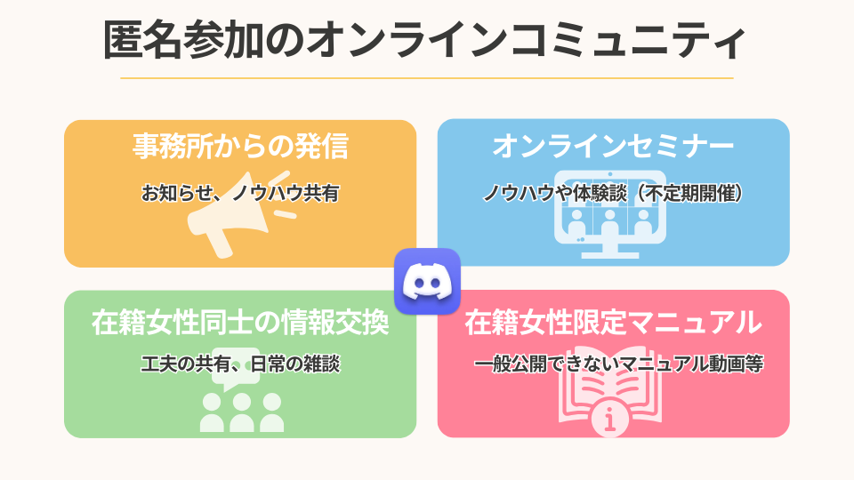 アイネットに所属しますと、匿名でオンラインコミュニティに参加いただけます。コミュニティ内では事務所からの有益な情報を公開、匿名でチャットレディ様にご質問なども可能です。